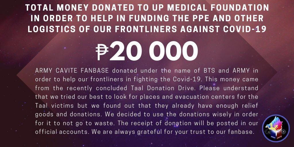 This is the official fanbase profile of ARMY Cavite Fanbase. Affiliated with PAPT, All For Bases, W.I.N.G. and PEARLS Alliance.ESTABLISHED SINCE NOV 2018